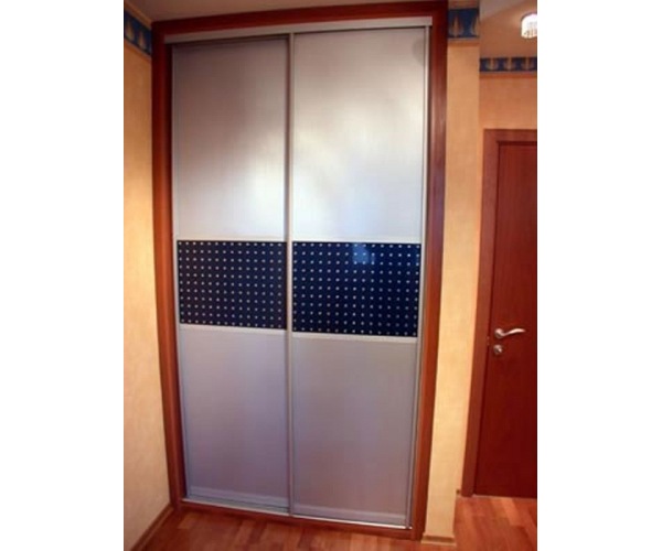 Компактный двустворчатый шкаф-купе представлен в стильном и оригинальном дизайне. Фасад выполнен в сером цвете с синими точечными вставками посередине. Внешний вид шкафа неброский, органично вливающийся в интерьер комнаты. Раздвижные створки модели оборудованы бесшумным механизмом раздвижения.