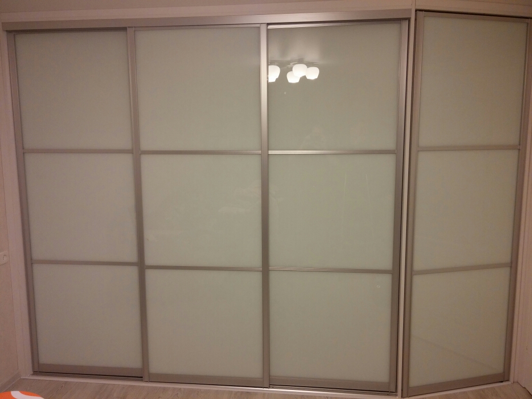 Двери без зеркал, стеллаж с полками слева. Ширина 152 см.