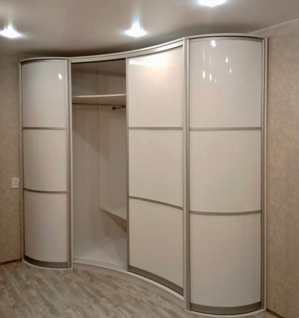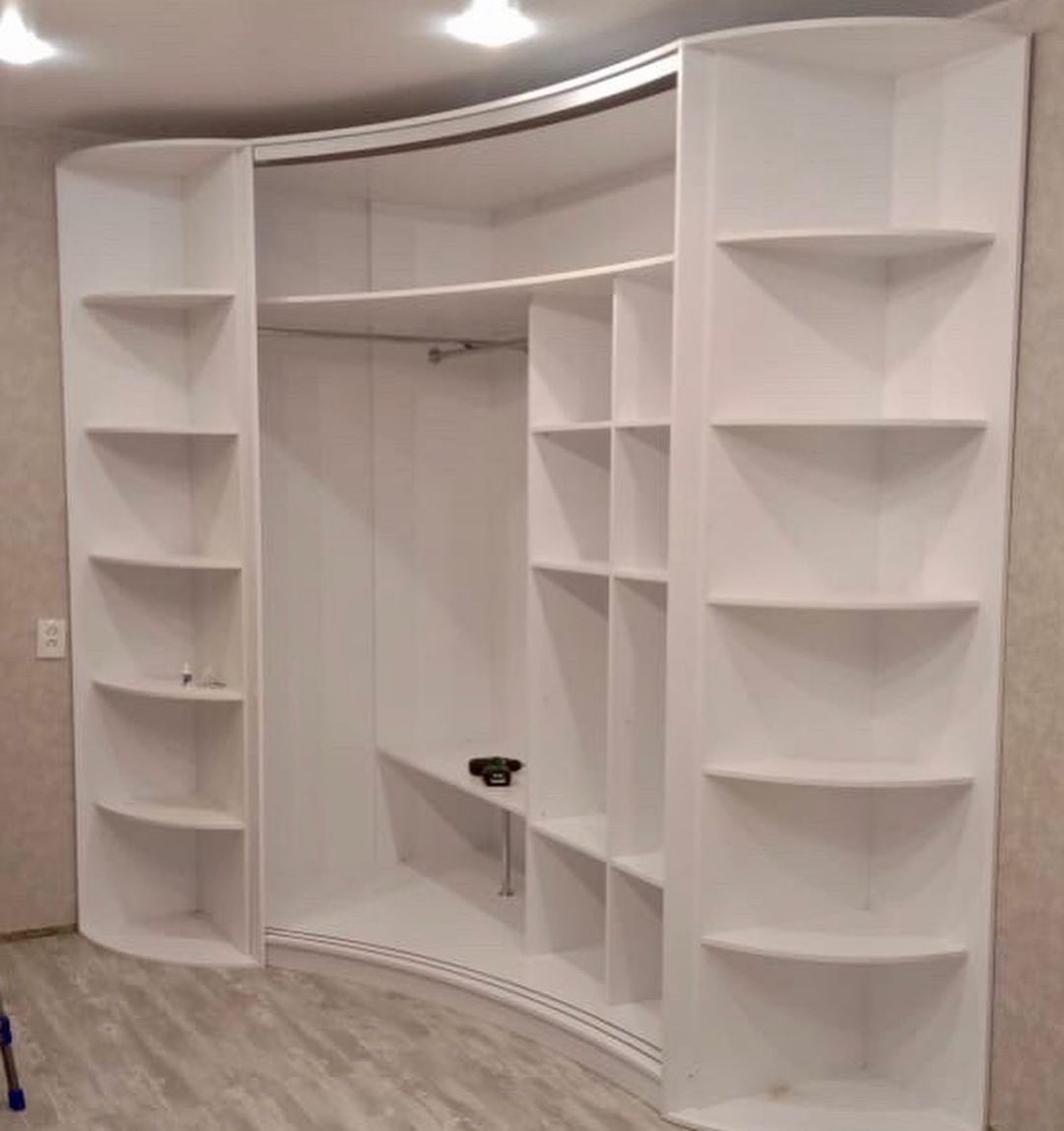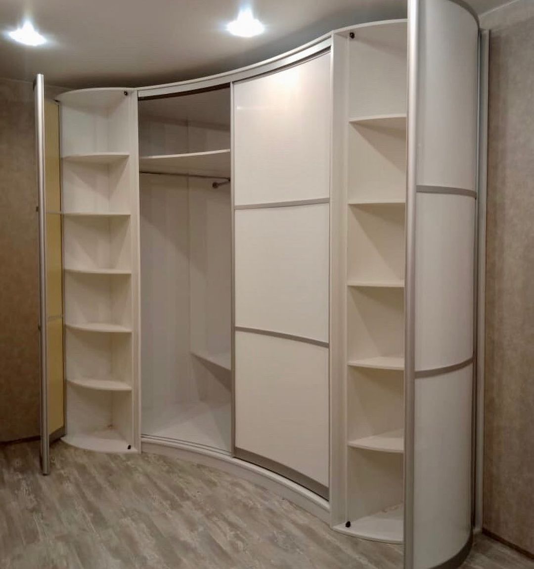Угловой шкаф-купе с открытыми полками и фигурными зеркалами