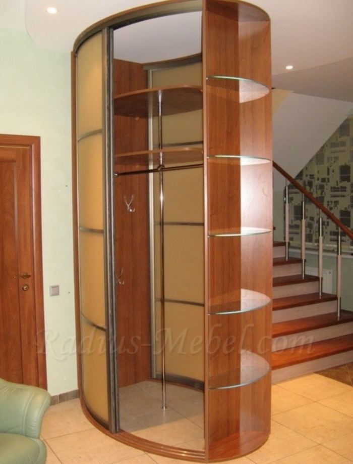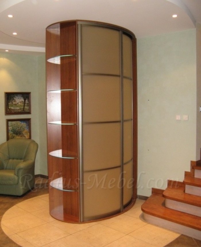 Двухсторонний радиусный шкаф-купе представляет собой неординарный образец мебели, который используется и для хранения вещей, и в качестве перегородки, которая разделяет пространство.