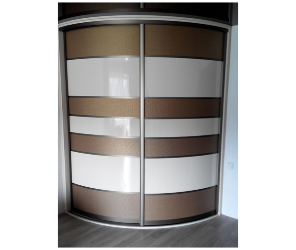 Радиусный шкаф-купе с комбинированным фасадом оснащен современной системой, отвечающей за беспроблемную работу створок. Модель выполнена из прочных материалов, за счет которых шкаф даже спустя время эксплуатации сохранит свою функциональность и презентабельный внешний вид.