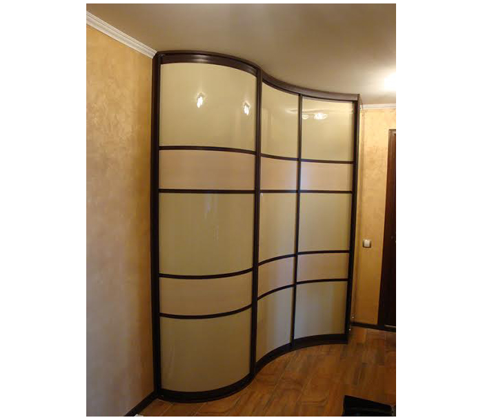 Радиусный шкаф-купе прекрасный выбор для небольших помещений. Данная модель имеет очень интересную волнообразную форму, что делает его более компактным. Фасад шкафа выполнен из глянцевого белого стекла в двух оттенках, что визуально продляет и расширяет пространство. А темного обрамление придает ему современный внешний вид.
