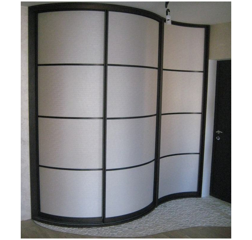 Модель выполнена в форме волны, что очень нестандартно и креативно смотрится. Встраиваемая конструкция состоит из трех дверей-купе. Темные линии образуют квадратный рисунок.