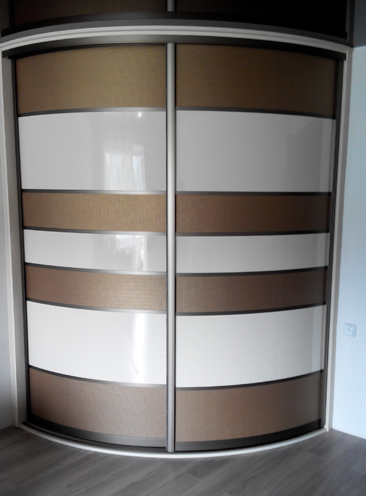Радиусный шкаф-купе имеет очень вместительную и компактную конструкцию за счет полукруглой формы фасада, который декорирован белым матовым пластиком и вставками из коричневой экокожи. Такой дизайн придает модели очень современный и слегка агрессивный внешний вид.