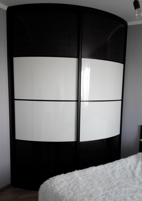 Очень привлекательный радиусный шкаф-купе имеет прочную конструкцию и фасад из двух створок белого и темно-коричневого цвета. Такле сочетание придает помещению интересных внешний вид и прекрасно впишется в интерьер в стиле минимализм и хайтек.