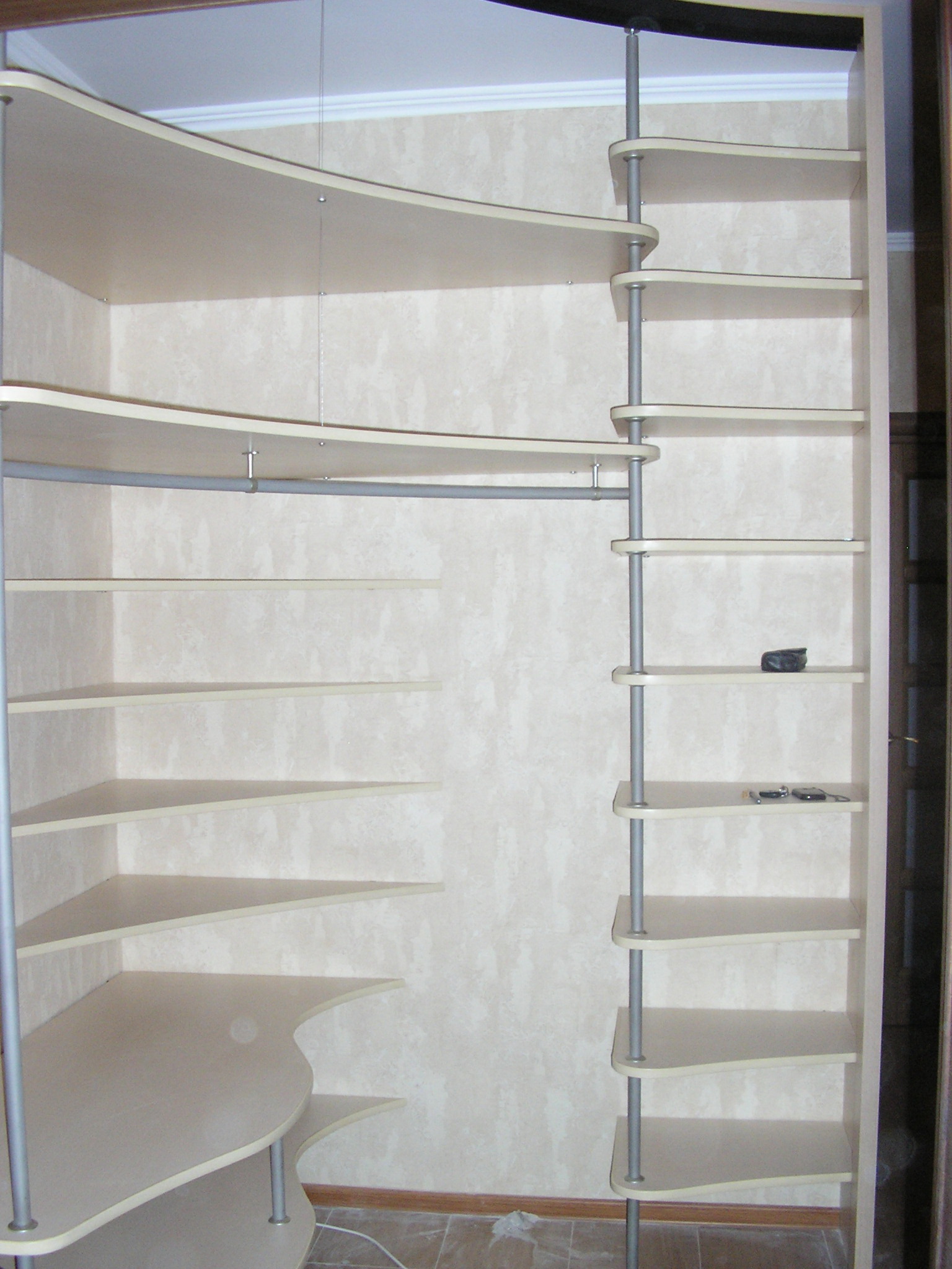 Изысканный и компактный радиусный шкаф-купе с удобным функционалом, представленным полками разнообразных форм для хранения вещей. Основой полок служат прочные металлические колонны. Створки модели раздвижные, в черно-белой отделке фасада.