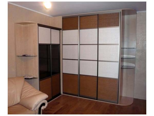 Разноуровневый угловой шкаф-купе со стеклянными приставными полками