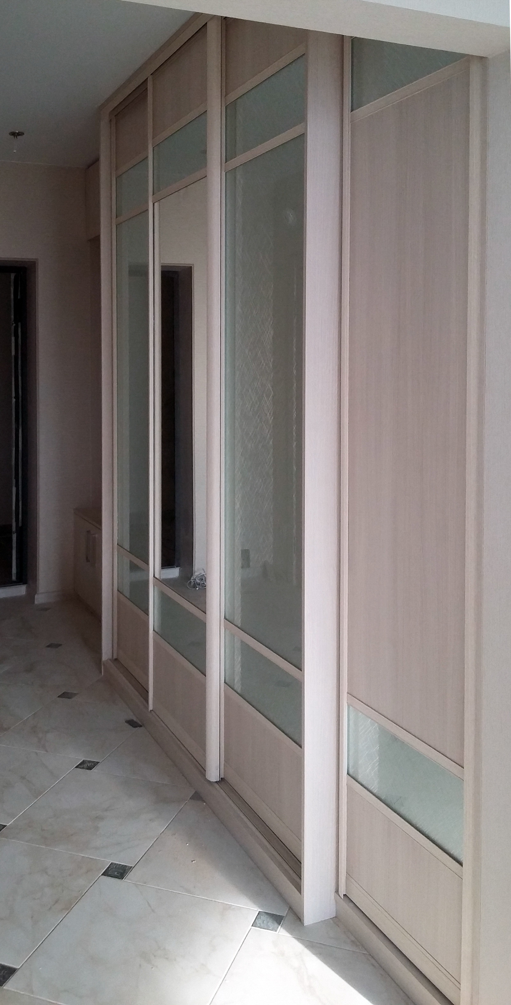 код 89154Фасад изготовлен в комбинации зеркал и панелей под светлый орех в тон профилю.
