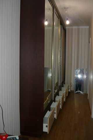 Широкий шкаф-купе для прихожей. Зеркальный фасад на несколько створок скрывает гардеробный отдел с нишами и стеллажами. Внизу расплоложены удобные выдвижные ящики.