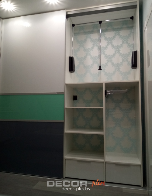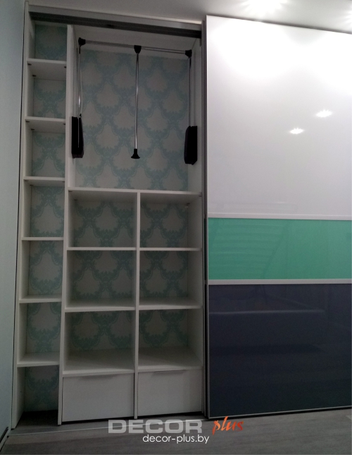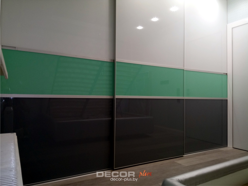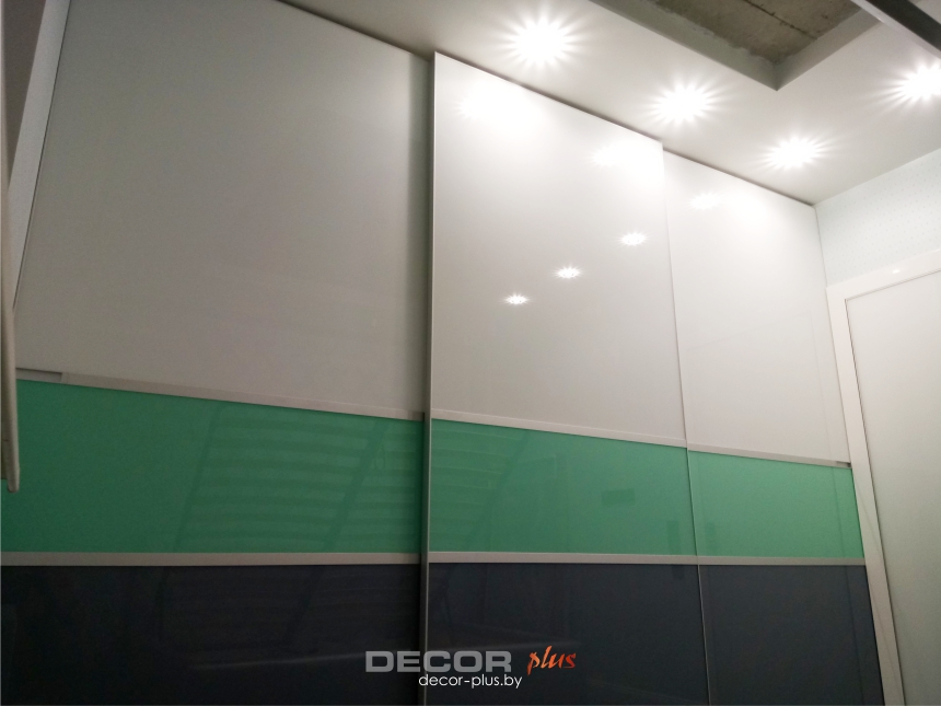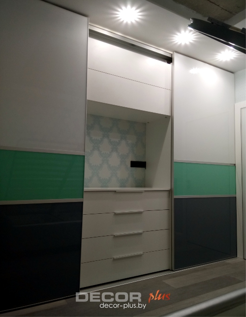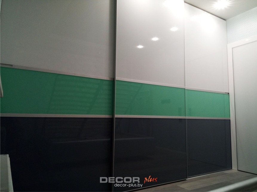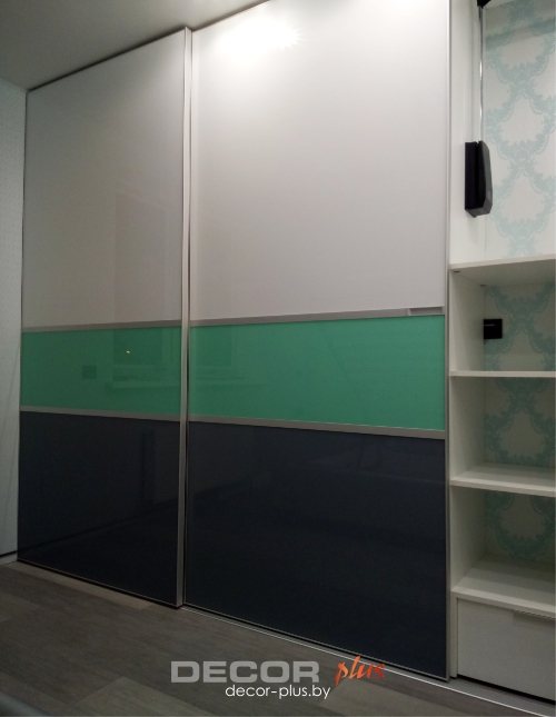 Встроенный трехстворчатый шкаф-купе с горизонтальной трехцветной комбинацией на дверцах белого, бирюзового и черного, свеху вниз соответственно. Скрытый профиль и белый каркас с просторной нишей по центру. Удобное наполнение.