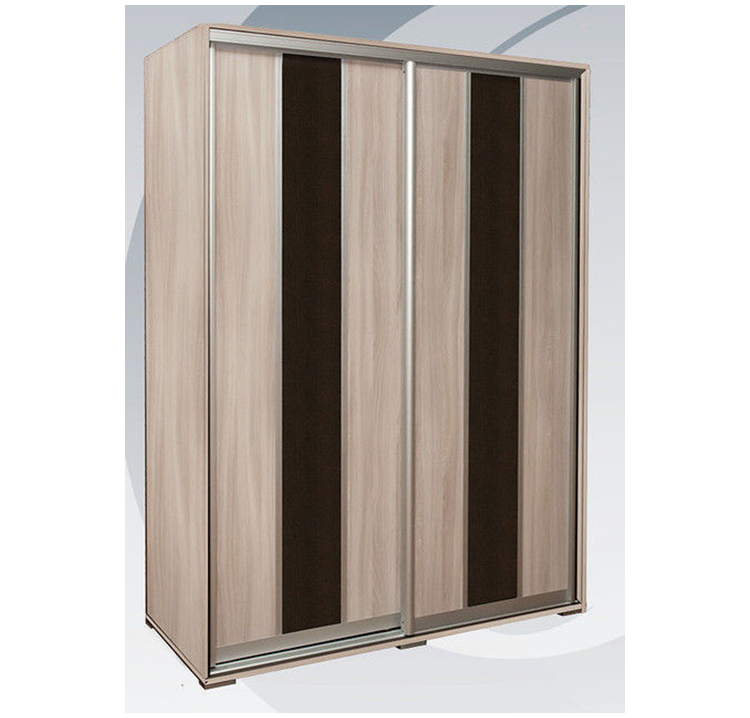 Компактный шкаф-купе отличается превосходной вместительностью, за счет отсутствия лишних детаей и наличием многочисленных полок и штанг для плечиков. Светлые створки шкафа украшают темные полоски, придающие модели элегантный внешний вид, и за счет этого прекрасно может вписаться в абсолютно любой современный интерьер.