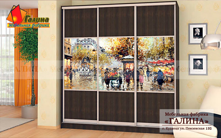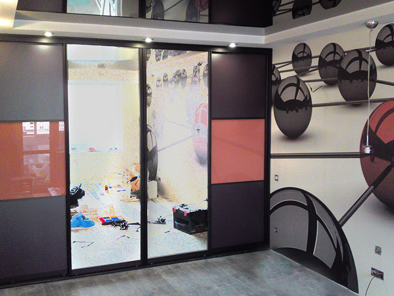 Встроенный трехстворчатый шкаф-купе с матовым стеклом и ящиками