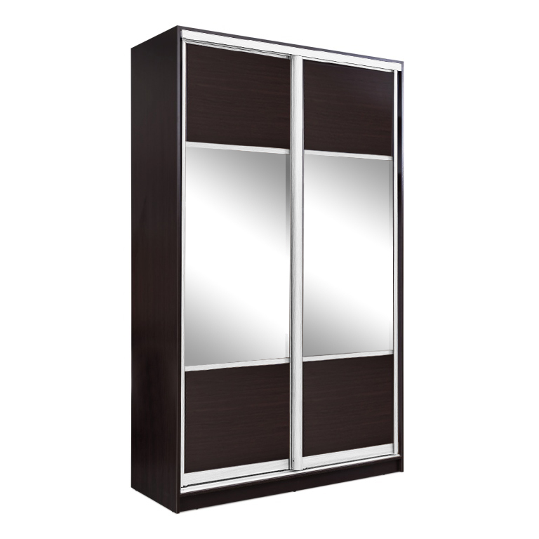 Малогабаритный шкаф-купе шириной чуть более одного метра выполнен в современном дизайне с двумя фасадными зеркалами, расположенными по центру каждой створки. Двери шкафа установлены на раздвижную систему Сенатор с серебристым матовым профилем.