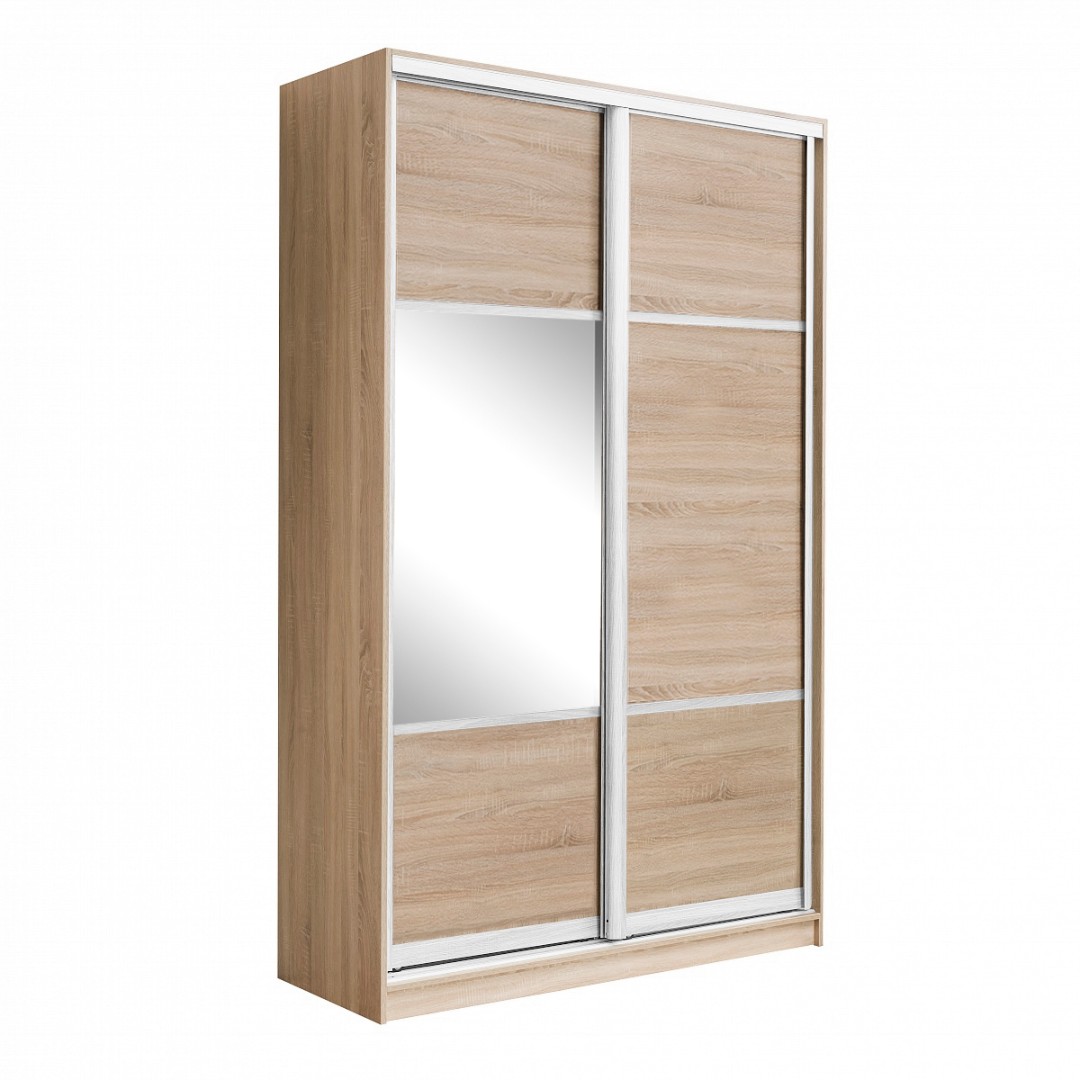 Шкаф с раздвижными дверями в древесном теплом оттенке с фактурным рисунком дуба. Система раздвижных дверей Senator имеет матовый алюминиевый профиль серебристого цвета. По середине правой створки установлено зеркало. Шкаф предполагает самостоятельную сборку по инструкции.