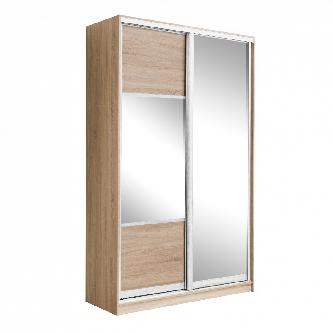 Практичный шкаф-купе для спальни в светлых древесных тонах. Шкаф комплектуется блоком из двух шухляд, матовым серебристым профилем и двумя фасадными зеркалами разного размера. Фабричный шкаф предполагает самостоятельную сборку.
