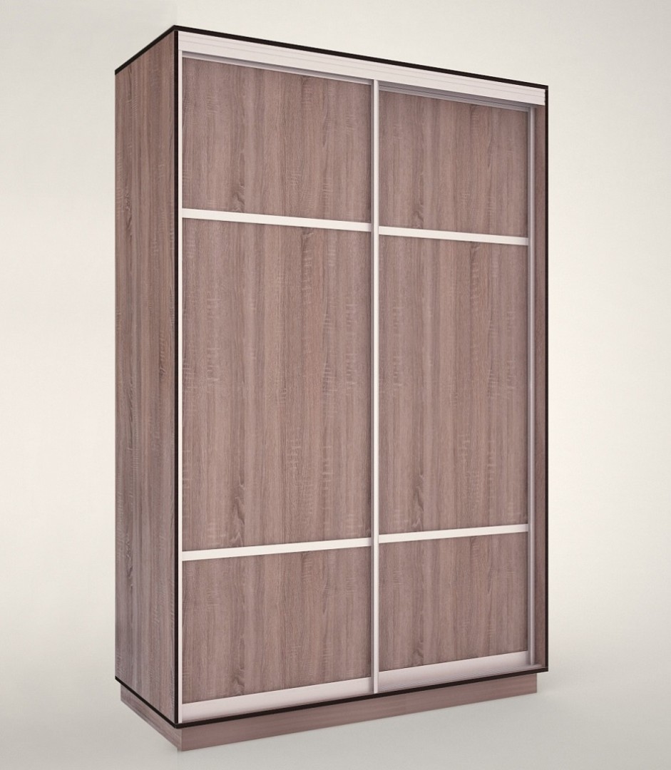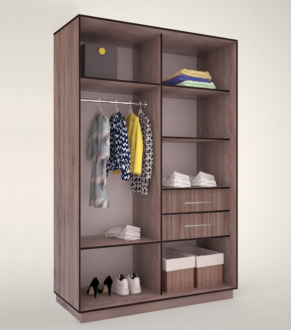 Узкий шкаф-купе с двумя глухими створками из ламинированной ДСП. Матовая ламинирующая пленка защищает плиту от влаги и повреждений. Шкаф имеет комплект ящиков, несколько полок и отделение со штангой шириной 72 см. Двери шкафа установлены на систему раздвижения Senator. Профиль выполнен из алюминия и выкрашен в светло-серый оттенок.