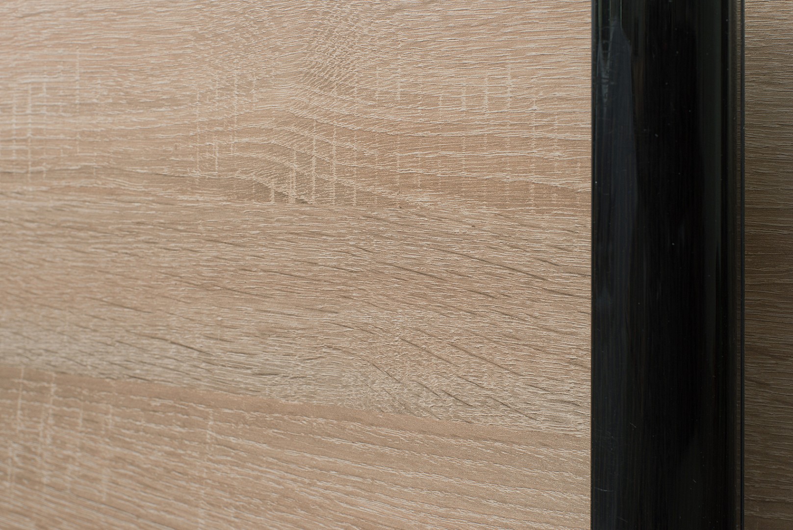 Шкаф-купе в размере 1,4 х 2,2 метра имеет систему раздвижения «Универсал» и металлический глянцевый профиль в цвете темного венге, который сочетается с корпусом изделия. Фасад шкафа выполнен из ламинированной ДСП в светлом бежевом цвете “дуб сонома” с фактурой дерева. Внутри шкаф оснащен металлической штангой, полками и ящиками для белья.