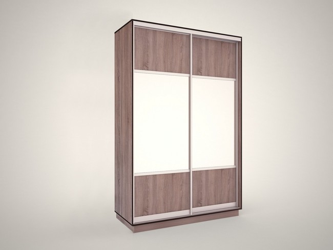 Шкаф-купе из ЛДСП имеет светлую древесную расцветку и дополнен серебристым профилем из алюминия. Шкаф предназначен для спальни, детской комнаты или узкой прихожей. Внутреннее пространство шкафа довольно вместительно за счет наличия полок, двух выдвижных ящиков для белья и штанги. Снаружи шкаф украшают зеркала, занимающие половину каждой двери.