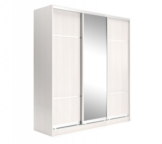 Белый шкаф купе с зеркалом для прихожей. Три створки установлены на матовый профиль жемчужного цвета. Фасад и корпус шкафа изготовлены из ЛДСП и имеют фактурную поверхность с рисунком дерева. Система хранения внутри шкафа разделена на три блока: полки, ящики и отделение со штангой для вешалок.