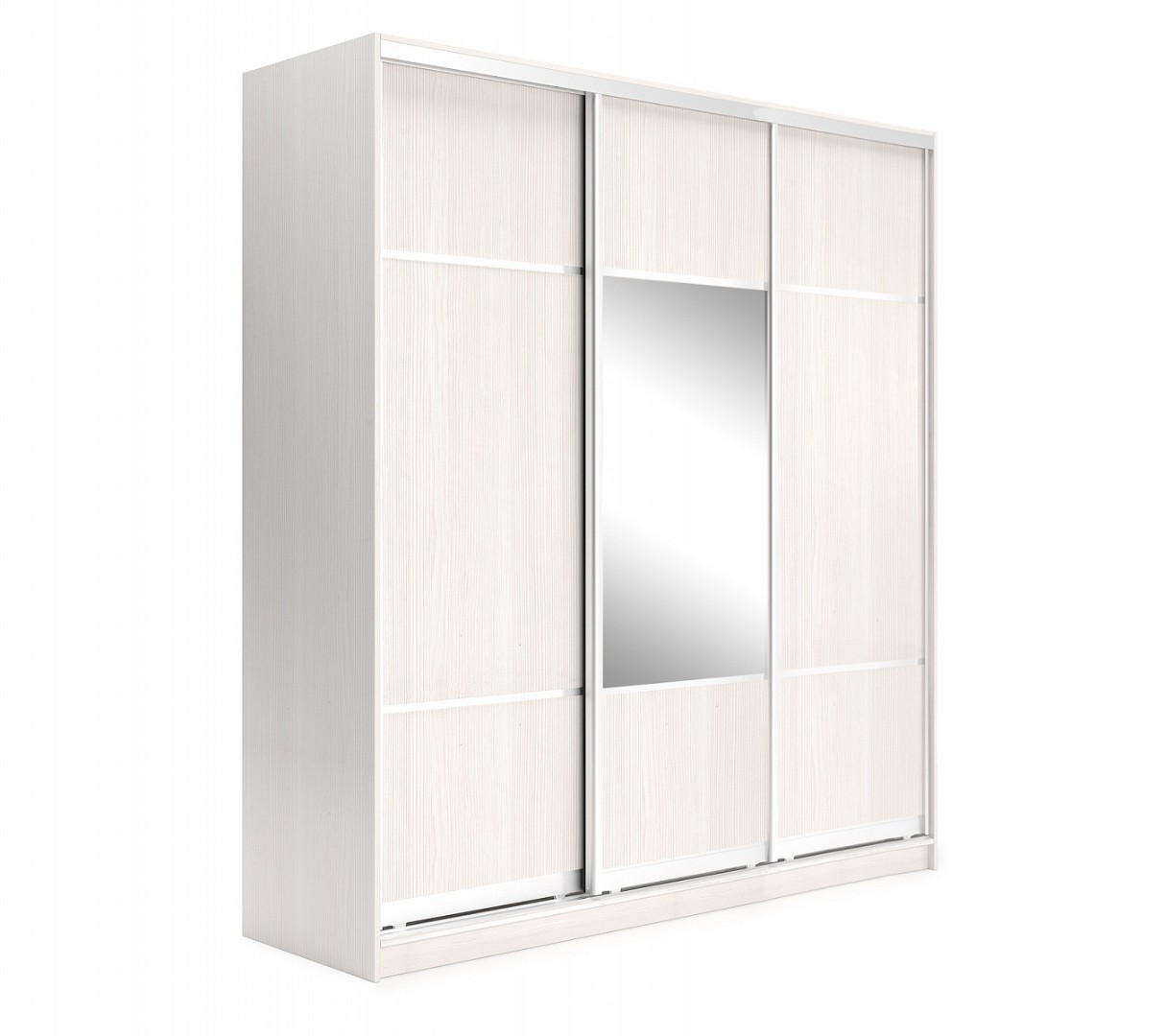 Белоснежный шкаф-купе выполнен из ламинированной ДСП и оснащен зеркалом на центральной створке. По периметру изделие декорировано металлическим профилем в серебристом оттенке. Плюсом модели несомненно являются встроенные шуфляды для белья, которые смогут заменить прикроватную тумбу или комод.