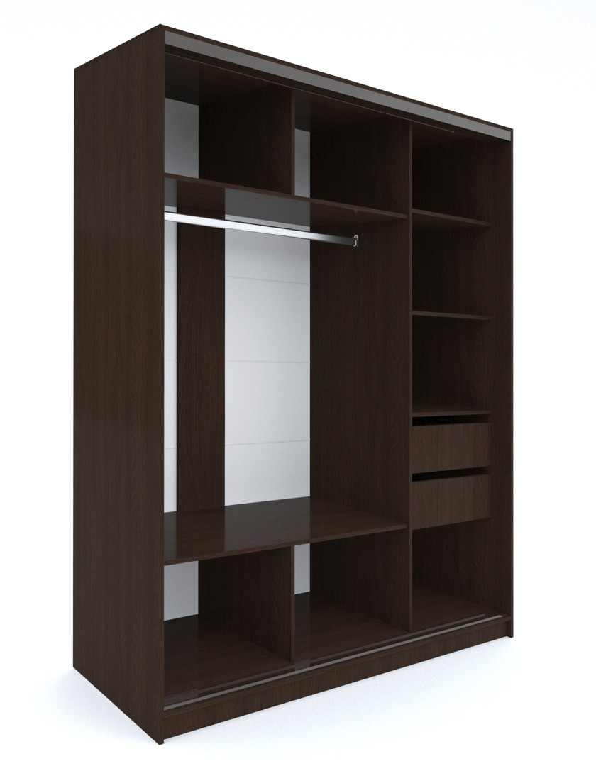 Шкаф-купе с раздвижной системой “Универсал” имеет алюминиевый глянцевый профиль стандартной ширины. Корпусная конструкция полностью изготовлена из ламинированной ДСП 16 мм в оттенке дуба венге и дуба трюфельного. Зеркальные полотна с обратной стороны проклеены специальной защитной пленкой, которая предотвращает падение осколков в случае разбития.
