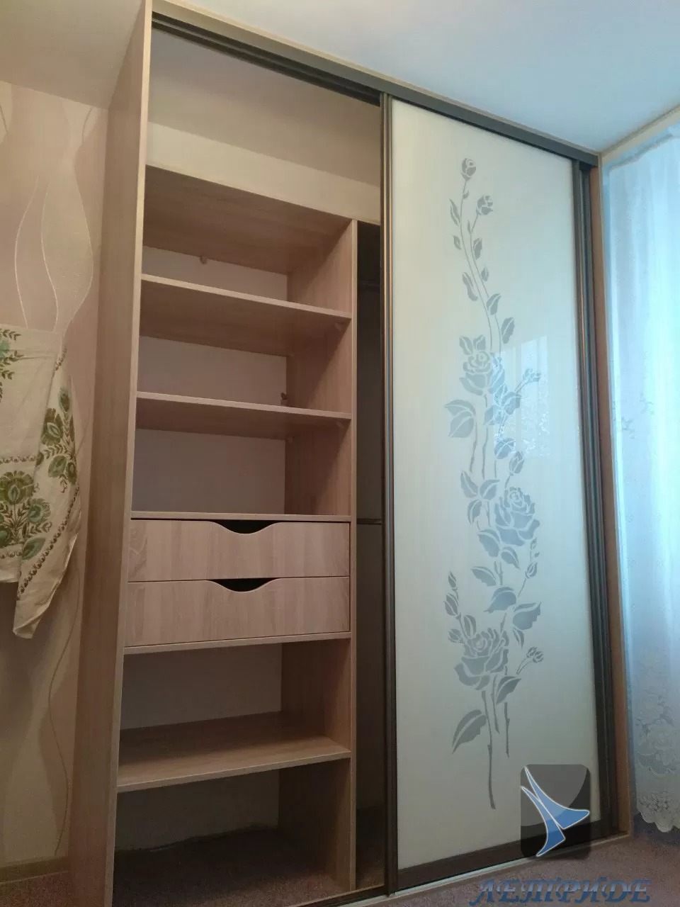 Однотонный шкаф-купе без зеркал с полками справа. Ширина 185 см.