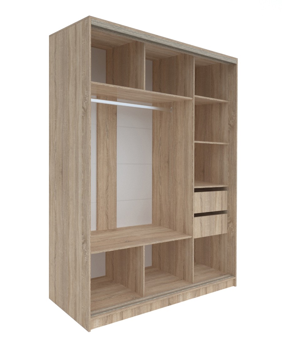 код 122958В правой части шкафа-купе расположены 3 полки и 2 выдвижных ящика, в левой – штанга для вешалок, полки.