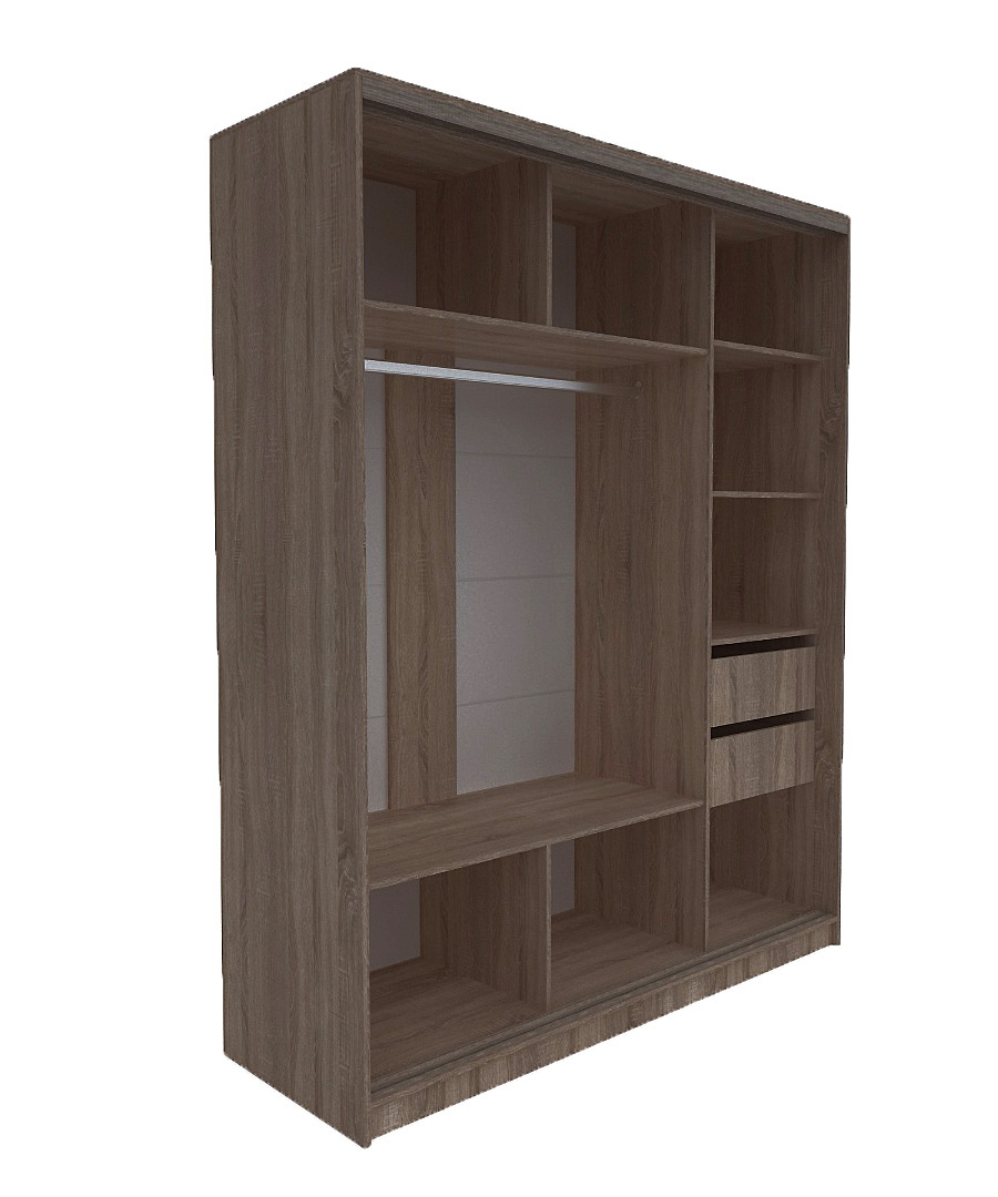 Шкаф-купе глубиной 60 см содержит штангу для вешалок, полки и выдвижные ящики внутри.