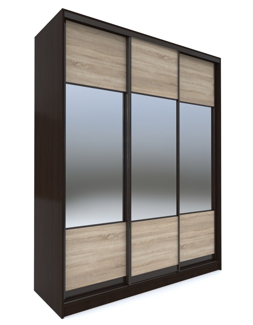 Шкаф-купе с тремя дверями в стандартной расцветке “дуб сонома/дуб венге”. Зеркала с обратной стороны оклеены противоосколочной защитной пленкой, что делает их более устойчивыми к разбитию и безопасными в случае повреждения. Створки раздвигаются за счет выступающего профиля, система раздвижения “Универсал” обеспечивает плавный ход каждой двери.