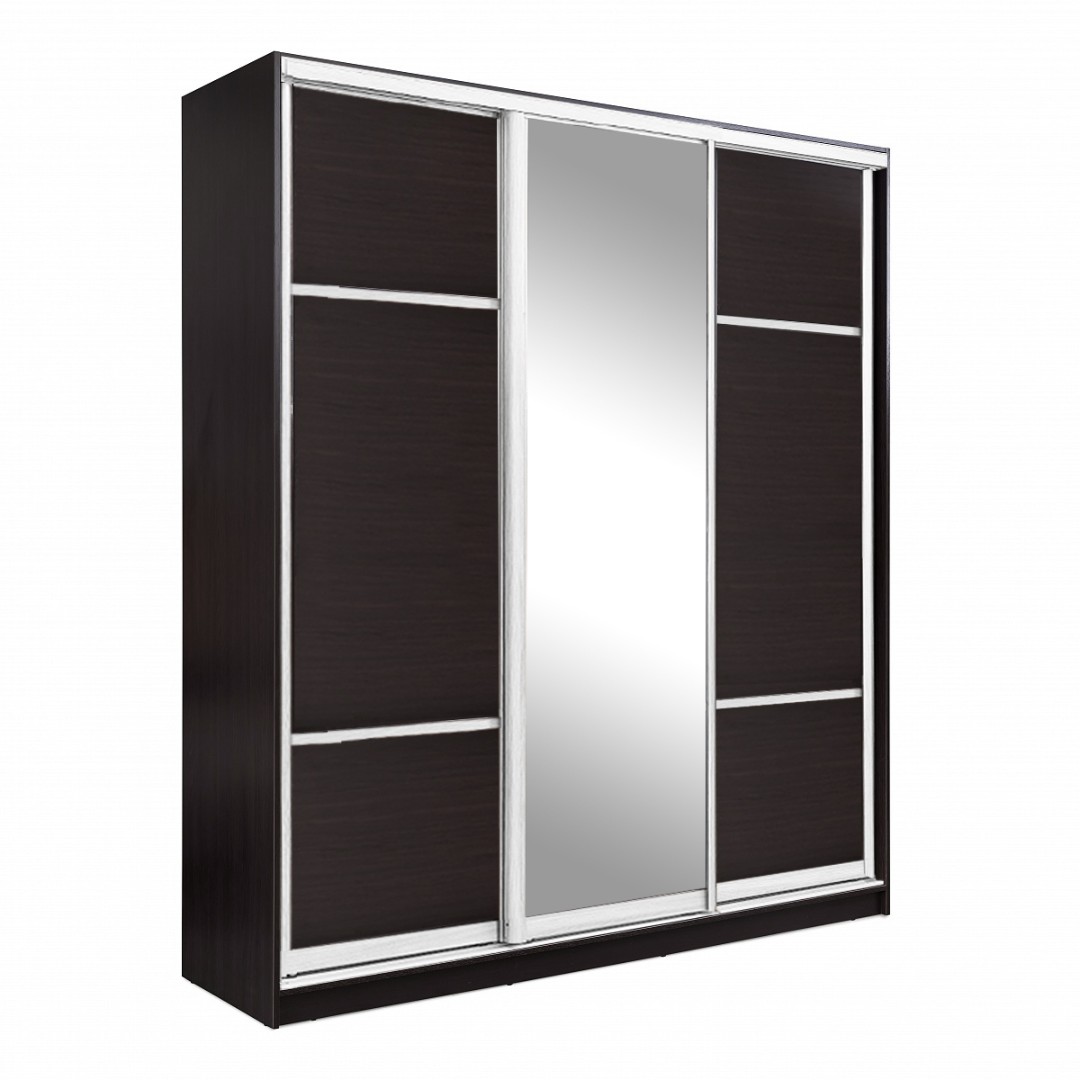 Шкаф купе в исполнении из темной ЛДСП с зеркалом на центральной двери имеет раздвижную систему Сенатор. Наполнение шкафа выполнено с умом: штанга, полки и шухляды избавят вас от проблемы нехватки пространства для хранения вещей. Количество и расположение зеркал может меняться при заказе.
