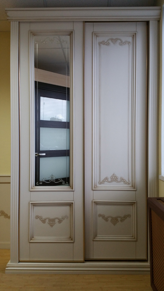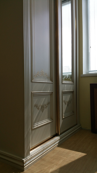 Креативный шкаф-купе с филигранно выполненными узорами на фасадах послужит отличным украшением для гостиной или спальни. Выполненный в классическом стиле с компактным зеркалом с гравировкой, шкаф не только привлекателен, но и достаточно вместителен и практичен.