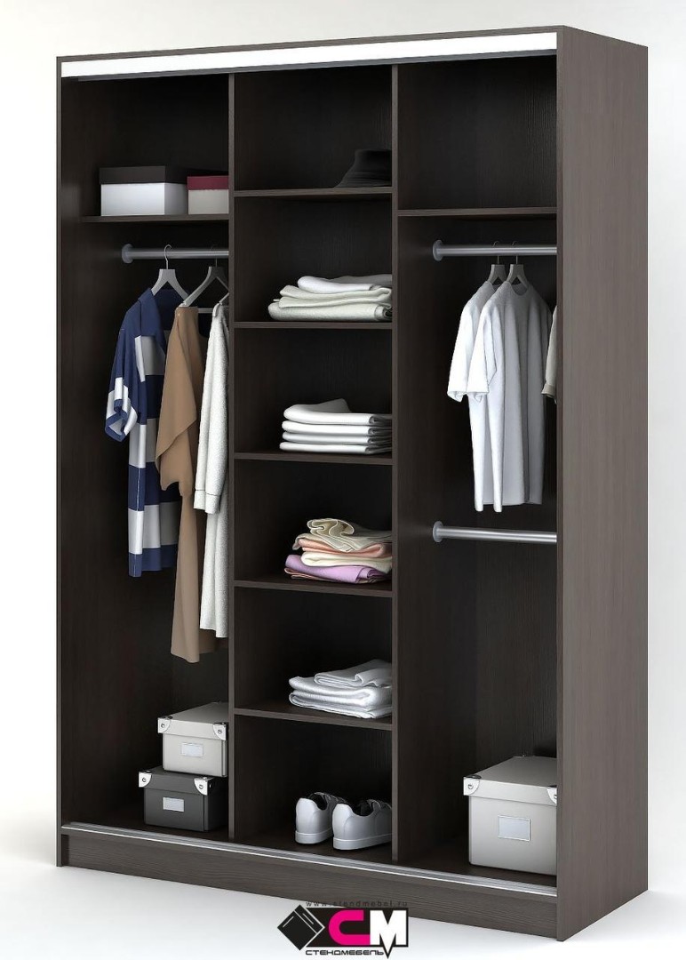 код 129736Три отсека шкафа с полками и тремя штангами.