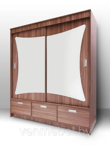Прямой шкаф-купе для спальни, гостиной либо прихожей. Двухстворчатая модель, на створках белая абстрактная вставка, на каждой дверце удобные ручки белого цвета. Ключевая особенность модели - в нижней части три вместительных, выдвижных ящика.