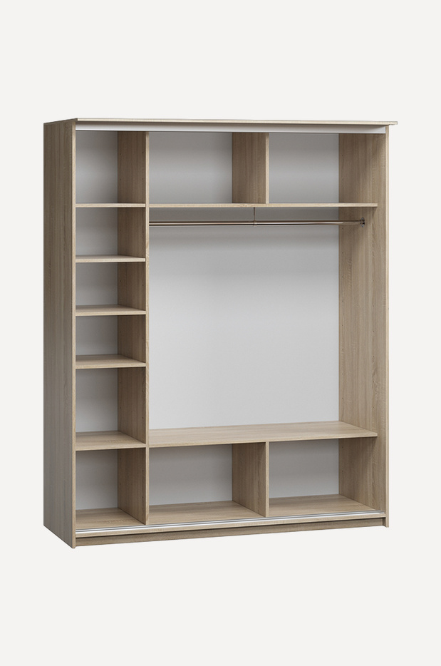 В центре располагается удобная штанга, обеспечивающая быстрый доступ к вещам, а в боковых отсеках – вместительные и удобные полки. Прочная и надежная нижнеопорная система направляющих, изготовленная из анодированного алюминия, обеспечивает бесшумный ход раздвижных дверей. Кроме того наличие ленты-щетки предотвращает попадание пыли внутрь шкафа, а так же способствует бесшумному открыванию и закрыванию створок.