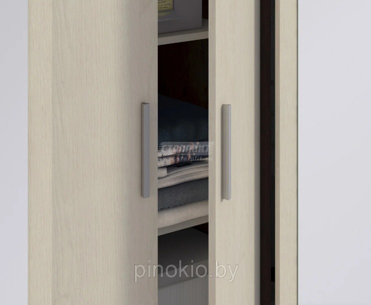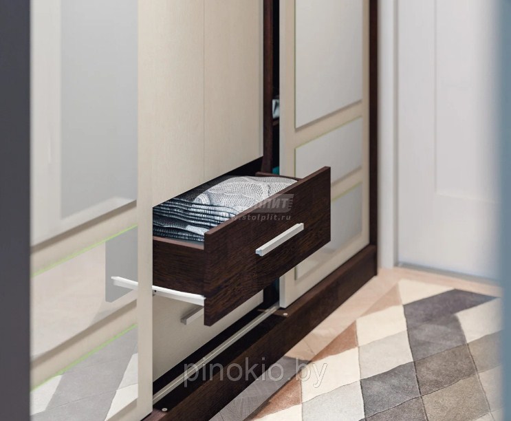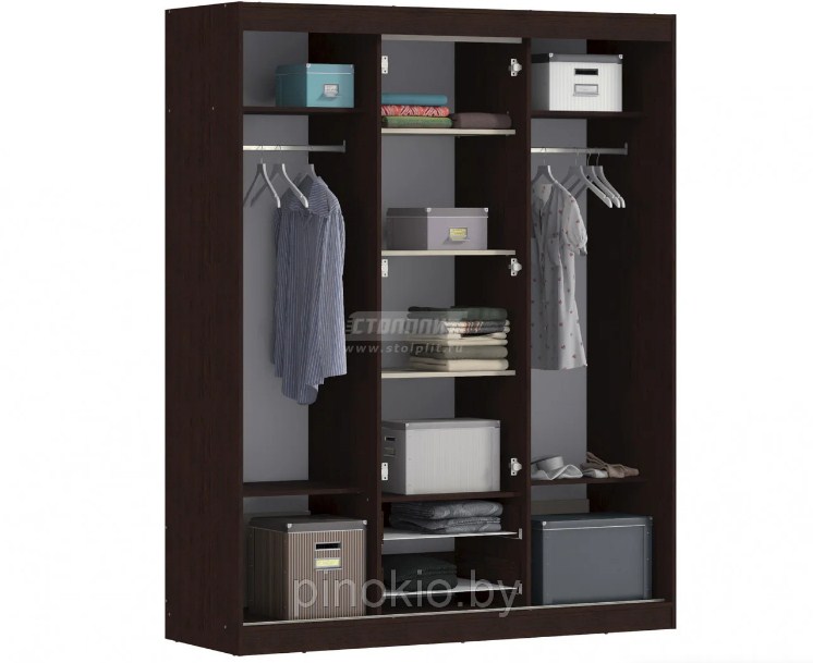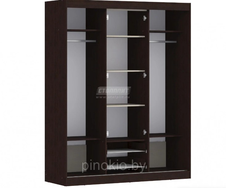В шкафу три больших отделения для одежды. В центральном отделении полки для белья, 2 выдвижных ящика, двери распашные. В правом и и левом- штанга и полка антресоль, двери раздвижные с зеркалом.