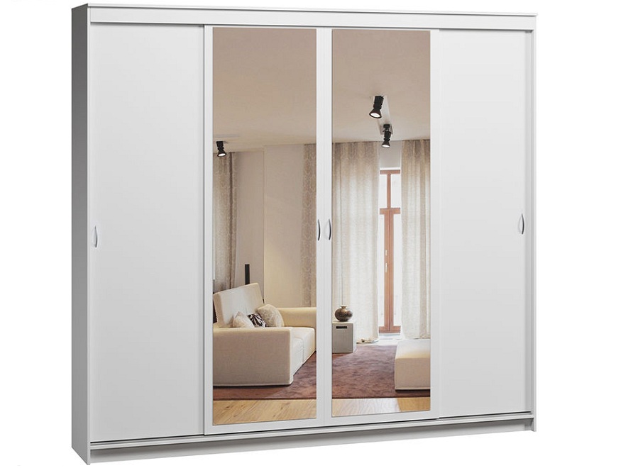 Четырехстворчатый шкаф-купе отличается хорошей вместительностью. Боковые раздвижные створки окрашены в белый цвет, центральные имеют зеркальную поверхность. Внутреннее наполнение шкафа оснащено перекладиной для вешалок, множеством полок и выдвижных ящиков для хранения одежды.