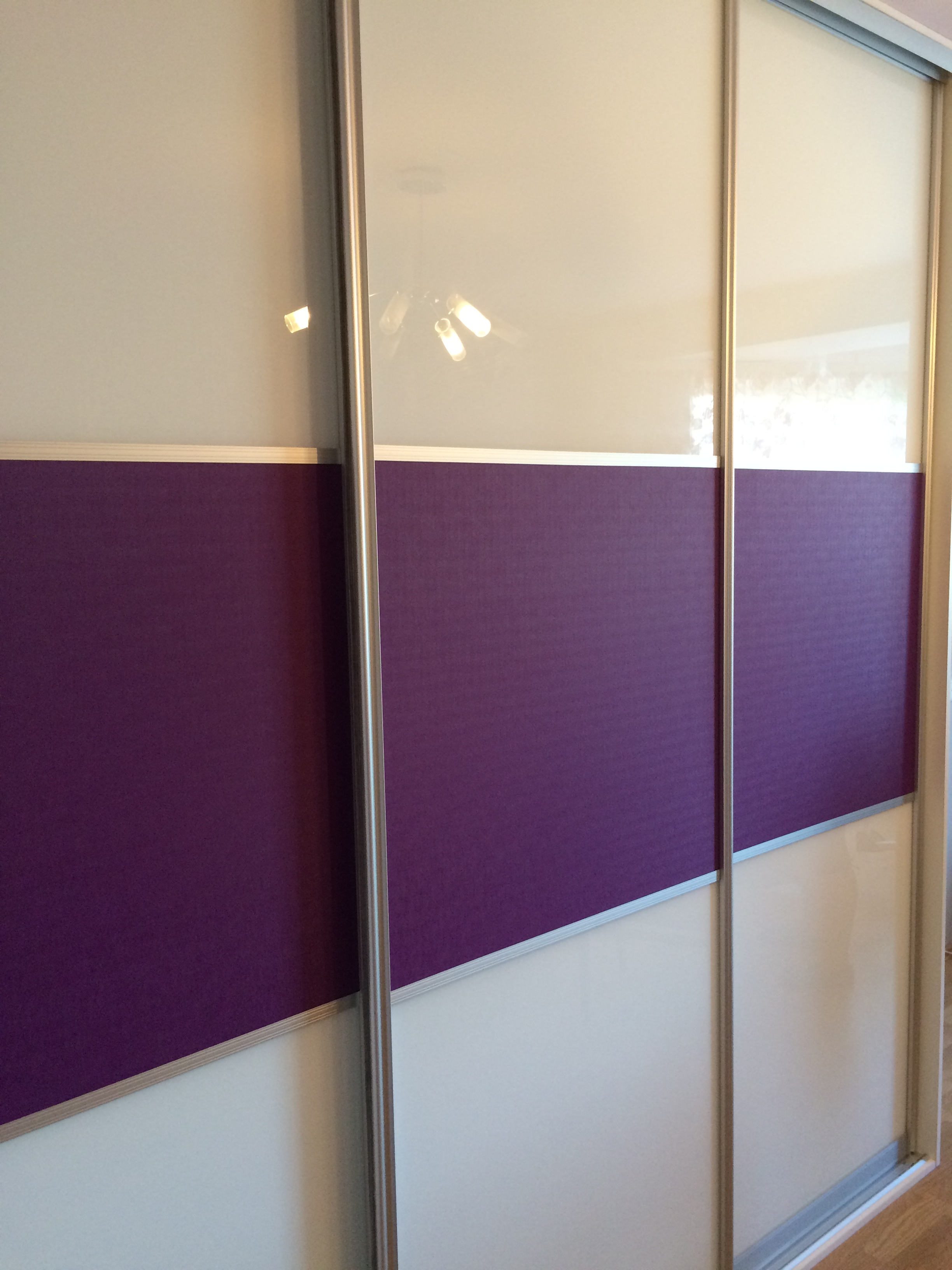 Линейный шкаф-купе выполнен в современном стиле, которому свойственны максимальная функциональность, простота и лаконичность. Три раздвижные створки выполнены из глянцевого белого стекла, декорированного широкой полосой фиолетового цвета с тканевой текстурой. Также дверцы украшает алюминиевый профиль.