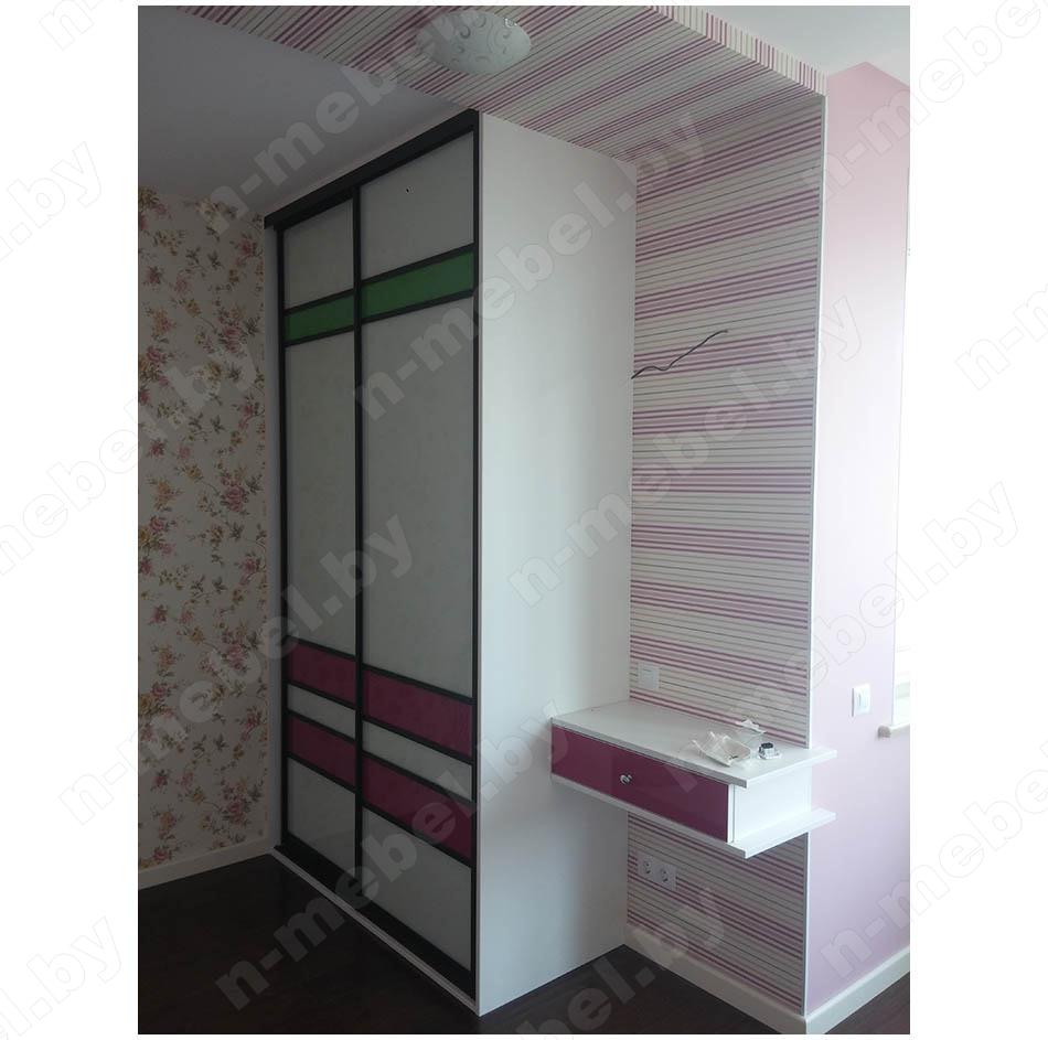 Шкаф-купе с белым матовым фасадом украшен несколькими вставками яркого цвета. С одной стороны шкаф снабжен небольшой полочкой с выдвижным ящичком. Современная модель будет отлично смотреться в светлой просторной спальне или сможет стать функциональной частью интерьера прихожей.