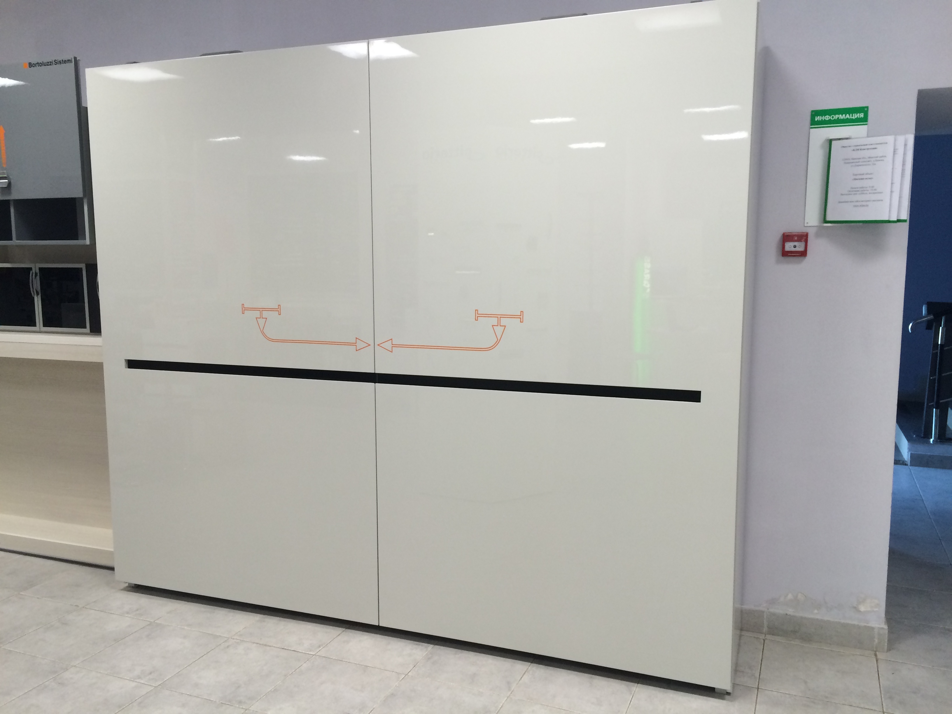 Двустворчатый шкаф-купе имеет линейную и очень вместительную конструкцию, которая позволяет устанавливать ее в любых помещениях. Короб и фасад створок выполнены в белом глянцевом цвете, а также дверки украшен черными полосами. Открывание осуществляется посредством предварительного нажатия и отодвигания.