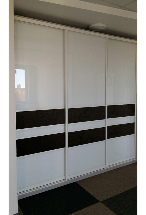 Линейный шкаф-купе выполнен в современном стиле, которому свойственны максимальная функциональность, простота и лаконичность. Три раздвижные створки выполнены из глянцевого белого стекла, декорированного двумя полосками глянцевого черного цвета. Также дверцы украшает алюминиевый профиль.