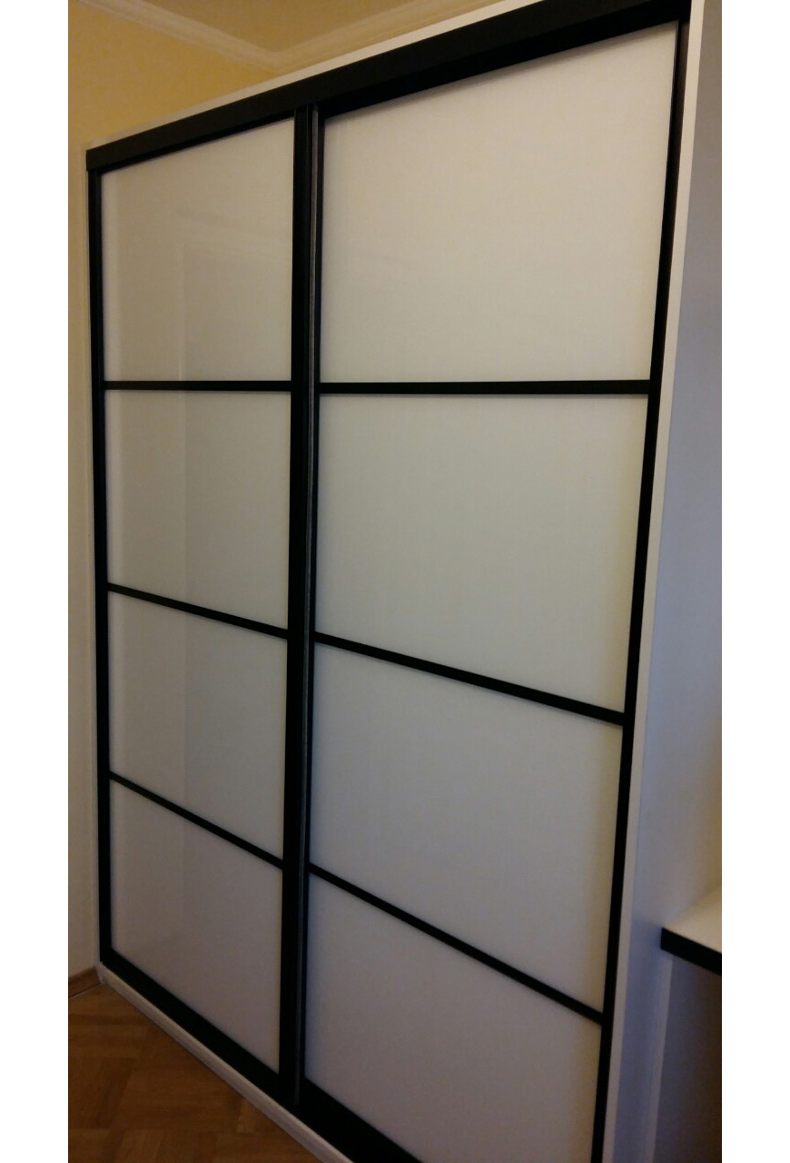 Многофункциональная линейная модель шкафа-купе выполнена в современном стиле, каркас и смежный компьютерный стол в торце выполнены в белом цвете. Две раздвижные створки изготовлены из глянцевого белого стекла, украшенного темным профилем, который придает модели геометричности и нотки японского стиля.