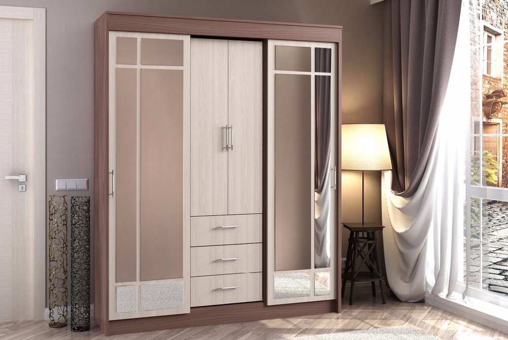 Корпусный двухцветный шкаф-купе с одним зеркалом. Одно отделение внутри. Ширина 112 см.