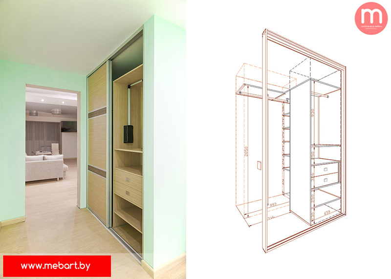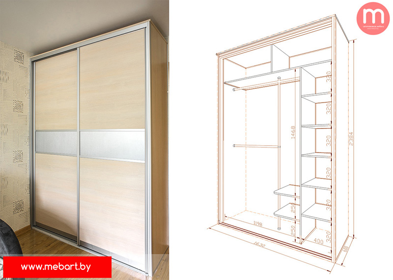 Фабричный шкаф-купе без зеркал с полками справа. Ширина 152 см.