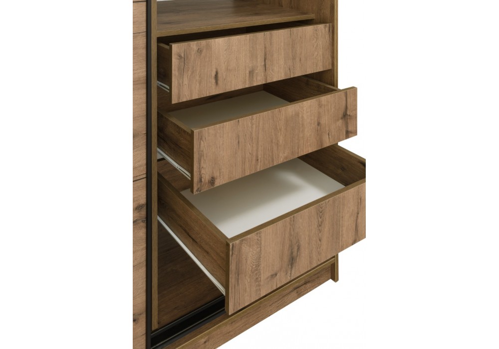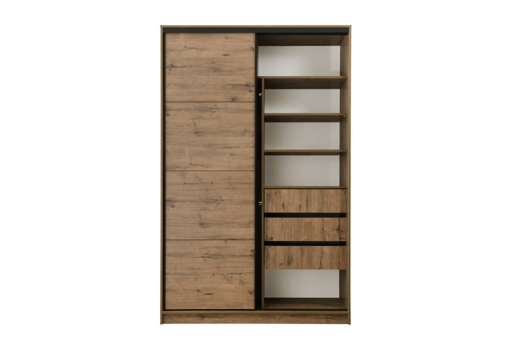 Темный шкаф-купе без зеркал с открытыми полками слева. Ширина 152 см.