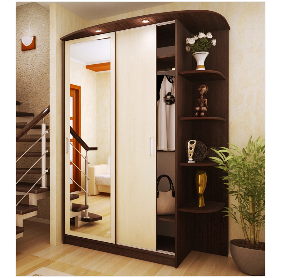 Шкаф-купе, несмотря на достаточно компактные размеры, отличается хорошей вместительностью. Функциональным дополнением служит встроенная подсветка и несколько открытых полок, на которые можно расставить рамки с фото всей семьи или декоративные предметы. Такой шкаф будет отлично смотреться в любом из интерьеров гостиной, спальни или прихожей.