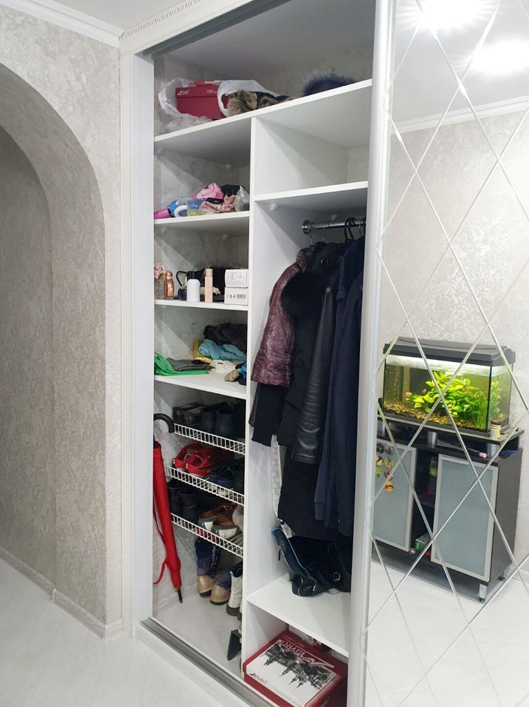 Шкаф-купе зеркальный шириной 233 см. Внутри выдвижные шухляды на шариковых направляющих.