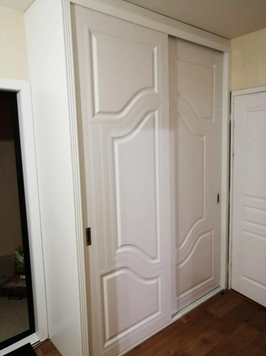 Корпусный шкаф-купе с белыми дверями без зеркал. Одно отделение внутри. Ширина 112 см.