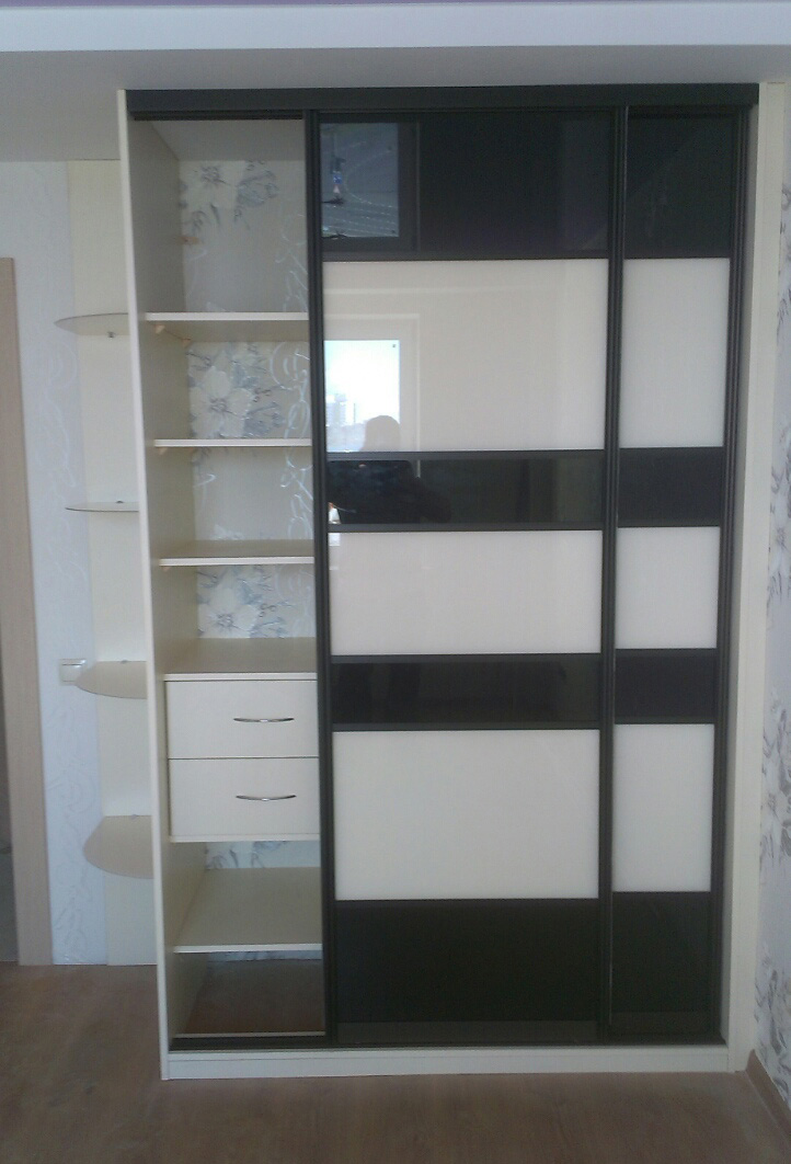 Линейная конструкция шкафа-купе прекрасно подойдет для небольшой комнаты зала и спальни. Светлый каркас в сочетании с полосатыми створками глянцевого белого и черного цвета дают очень интересный контраст, который привлечет внимание и визуально расширит пространство. Также на торце шкафа установлены стеклянные полки для удобного расположения вещей, книг и элементов декора.