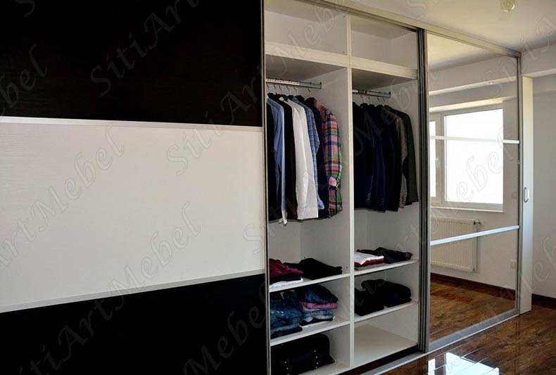 Большой шкаф-купе с множеством отделов для одежды отлично впишется в интерьер просторной спальни или прихожей. Центральная створка модели украшена большой зеркальной вставкой. Боковые створки окрашены в черный цвет, дополненный белой вставкой. Внутреннее наполнение позволит в комфорте хранить гардероб всей вашей семьи.