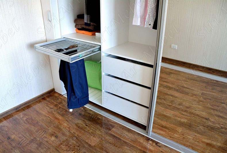 Ширина шкафа – 203 см, глубина – 60 см. Внутри помещается 8-10 комплектов одежды на вешалках.
